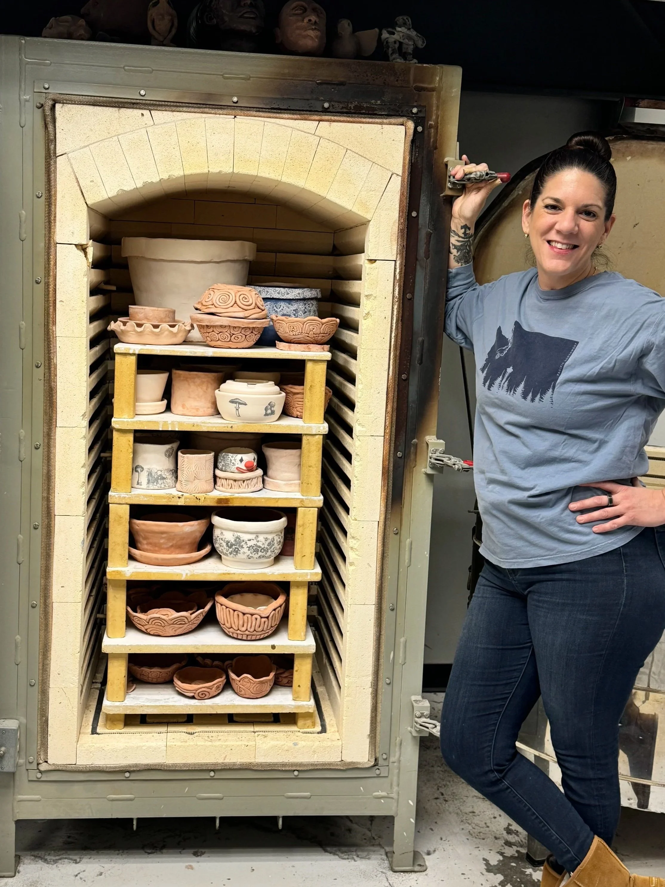 With a large front-loader kiln at New Rochelle High School, full of student work.